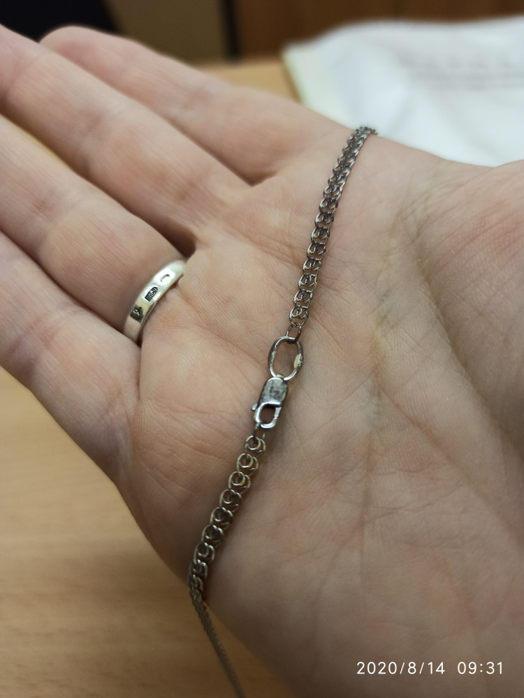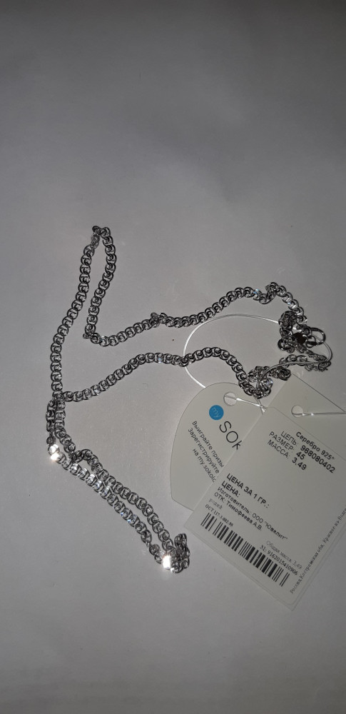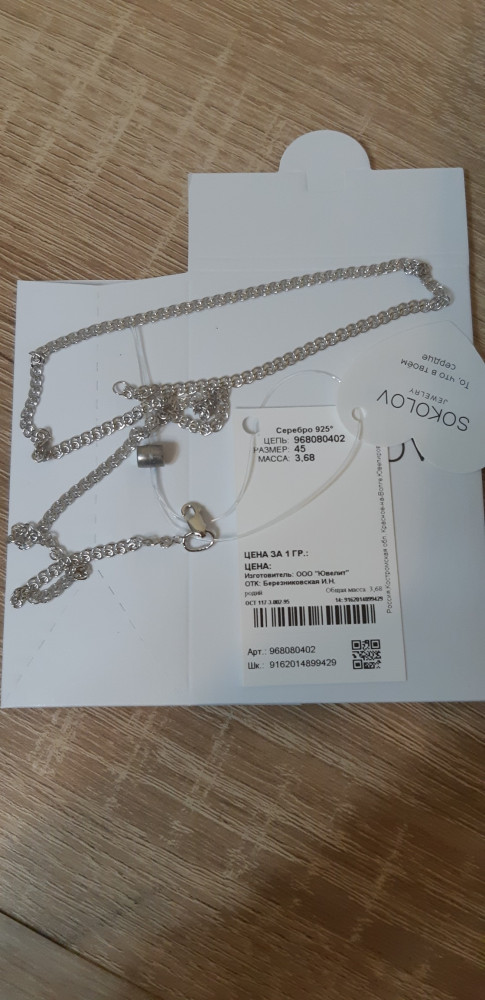 Несколько месяцев назад купила эту цепь, носила очень редко. И вот обнаружила, что замок окислен, а вернее облез. Сама цепь тоже образует складку, когда висит на шее. На фото для сравнения браслет, купленный ранее, тоже соколовский. С ним всё в порядке, хотя на руке он постоянно.