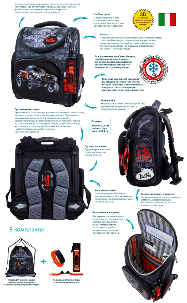 DeLune Ранец с наполнением «Внедорожник»В данный момент этот товар отсутствует в продаже. Возможно, у нас найдется аналогичный или похожий товар здесь. Серия: 3-серия Ранец школьный каркасный, украшенный объёмной 3D картинкой, — это совершенно уникальное решение, сочетающее яркую, большую картинку и ощущение, что понравившийся мишка или котенок настолько реальны (благодаря 3D технологии), что они могут «ожить». |