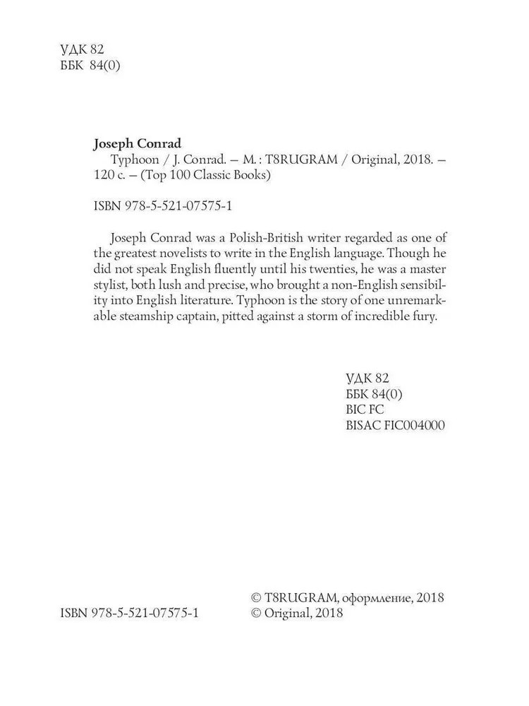 💳 Оплатить за товар можно при получении 🇰🇿 Есть бесплатная доставка по Казахстану от 1 дня 🎁 Копите бонусы с каждой покупки Серия: Top100 Classic Books Joseph Conrad was a Polish-British writer regarded as one of the greatest novelists to write in the English language. Though he did not speak English fluently until his twenties, he was a master stylist, both lush and precise, who brought a non-English sensibility into English literature. Typhoon is the story of one unremarkable steamship captain, pitted against a storm of incredible fury. |