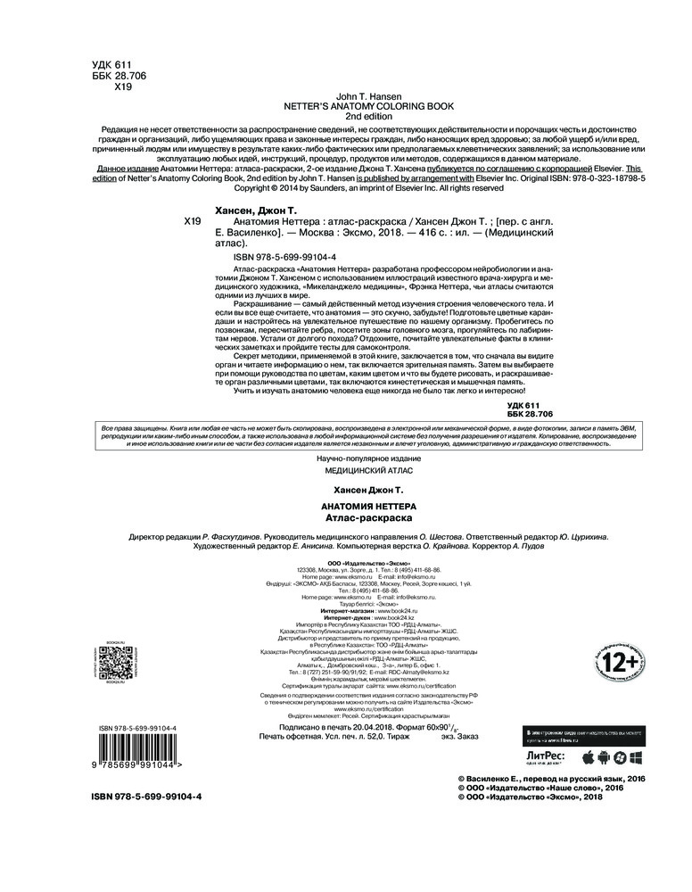 💳 Оплатить за товар можно при получении 🇰🇿 Есть бесплатная доставка по Казахстану от 1 дня 🎁 Копите бонусы с каждой покупки Серия: Медицинский атлас Атлас-раскраска Анатомия Неттера разработана профессором нейробиологии и анатомии Джоном Т. Хансеном используя иллюстрации известный врача-хирурга и медицинского художника, «Микеланджело медицины», Фрэнка Неттера, чьи атласы считаются одними из лучших в мире. Раскрашивание — самый действенный метод изучения строения человеческого тела. И если вы все еще считаете, что анатомия — это скучно — Забудьте! Подготовьте цветные карандаши и настройтесь на увлекательное путешествие по нашему организму. Пробегитесь по позвонкам, пересчитайте ребра, посетите зоны головного мозга, прогуляйтесь по лабиринтам нервов. Устали от долгого похода? Отдохните, почитайте увлекательные факты в клинических заметках и пройдите тесты для самоконтроля.Секрет методики, применяемой в этой книге, заключается в том, что сначала вы видите орган и читаете информацию о нем, так включается зрительная память. Затем вы выбираете при помощи руководства по цветам каким цветом и что вы будете рисовать и раскрашиваете орган различными цветами, так включаются кинестетическая и мышечная память. Учить и изучать анатомию человека еще никогда не было так легко и интересно! |