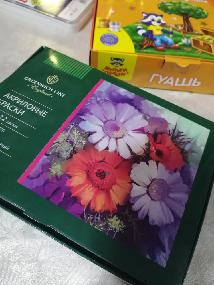 В наборе одновременно представлены разные виды акриловых красок, очень удачный набор для творчества и первичного ознакомления ребенка с акриловыми красками.