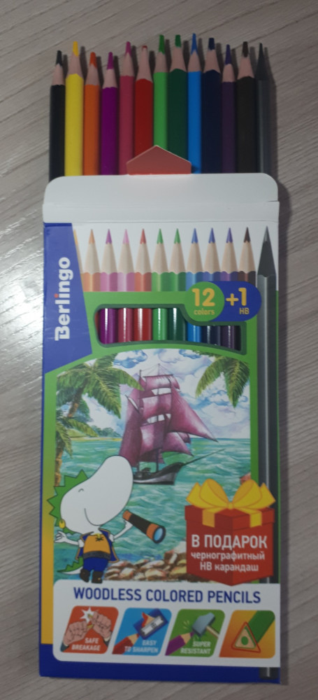 Цветные карандаши фирмы Berlingo очень хорошего качества. Карандаши трехгранные, что очень удобно при их использовании детьми. Цвета яркие. Грифель мягкий. Карандаши легко затачиваются, не ломаются при заточке. Упаковка снабжена специальным "язычком" для легкого открывания ребенком. Чернографитный карандаш твердо-мягкий (очень удобно, что данный карандаш входит в комплект, т.к. можно с собой и в поездку и в школу взять только данный набор и ребенок сможет сразу нарисовать рисунок чернографитным карандашом и разукрасить его цветными карандашами). Большое спасибо!