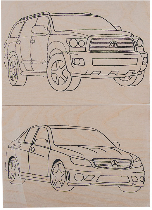 Состав набора: две фанеры формата А5 с контурным рисунком, прибор для выжигания и 6 насадок.