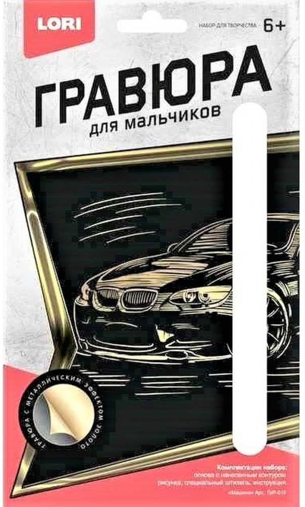 Малая гравюра Lori «Машина» с металлическим эффектом содержит в комплекте основу с нанесенным контуром, специальный штихель и инструкцию на русском языке. Контур изображения уже нанесен на черный фон. Сцарапывая верхний слой гравюры специальным штихелем, входящим в набор, ребёнок создает картину-гравюру.