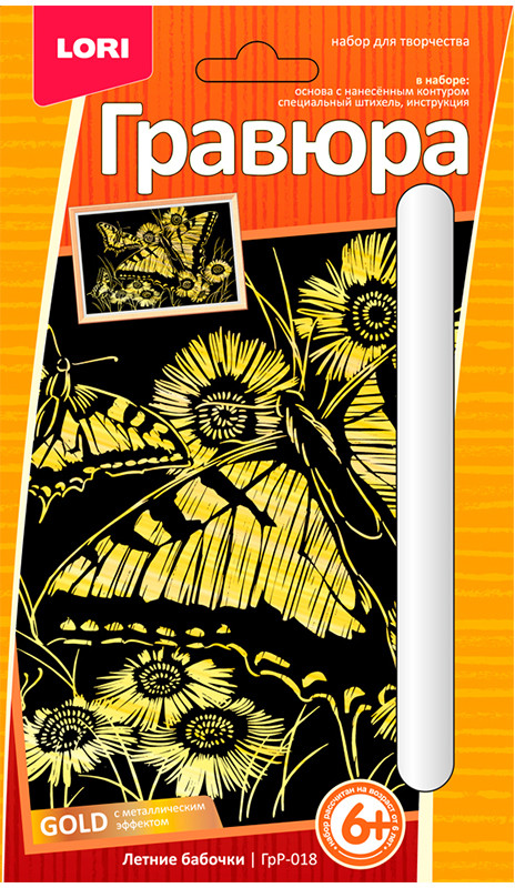 Lori Гравюра малая с эффектом золота «Летние бабочки»В данный момент этот товар отсутствует в продаже. Возможно, у нас найдется аналогичный или похожий товар здесь. Малая гравюра «Летние бабочки» с металлическим эффектом «под золото» содержит в комплекте основу, на которую нанесена краска с контуром рисунка, специальный штихель и инструкцию. Контур изображения уже нанесен на черный фон основы. С помощью специального штихеля изображение процарапывается по контуру, и из-под слоя краски появляется блестящая золотистая основа. В результате получается контрастный рисунок с эффектным изображением. |