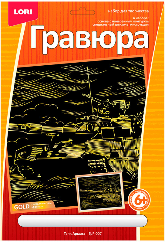 Lori Гравюра с эффектом золота «Танк Армата»В данный момент этот товар отсутствует в продаже. Возможно, у нас найдется аналогичный или похожий товар здесь. Малая гравюра «Танк Армата» с металлическим эффектом «под золото» содержит в комплекте основу, на которую нанесена краска с контуром рисунка, специальный штихель и инструкцию. Контур изображения уже нанесен на черный фон основы. С помощью специального штихеля изображение процарапывается по контуру, и из-под слоя краски появляется блестящая золотистая основа. В результате получается контрастный рисунок с эффектным изображением. |