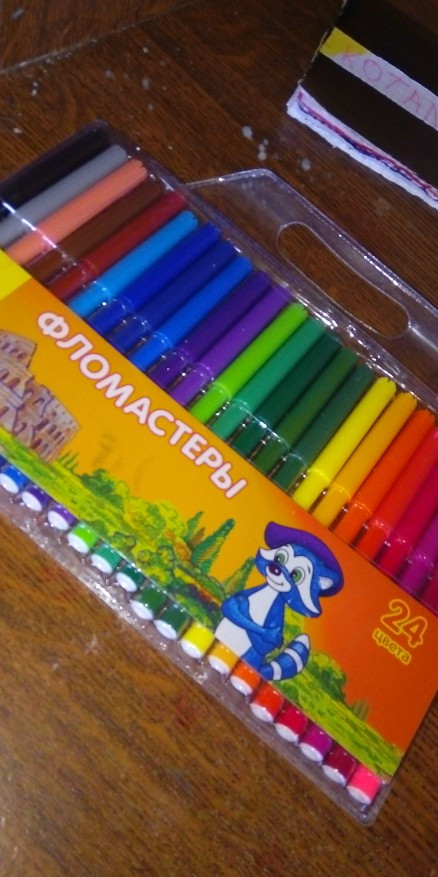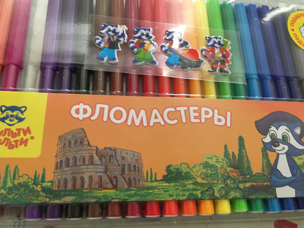 Хорошие фломастеры. Пришли свежие, детям нравятся, хорошо отмываются. Плюс наклейки енотики.