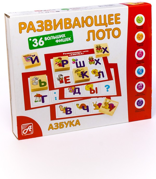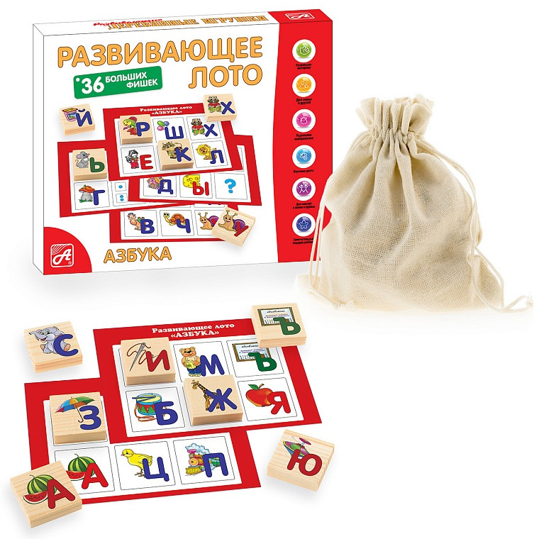 С помощью развивающего лото от торговой марки «Анданте» ребенок научится азбуке, поскольку вместо привычных цифр на карточках данного лото только буквы русского алфавита и рисунки. Дошколенка можно не только познакомить с буквами, но и в атмосфере игры помочь ему запомнить их как можно скорее. Играть в лото предстоит веселой компанией, поэтому такой полезный досуг точно не наскучит.