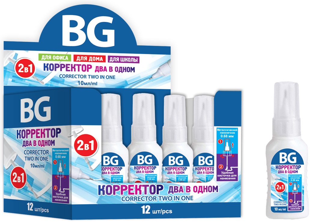 Корректирующая жидкость на быстровысыхающей основе «BG» 2 в 1 с универсальным двусторонним наконечником. Ручка с металлическим наконечником идеальна для точечной корректировки, а колпачок с кисточкой — для объемных исправлений. |