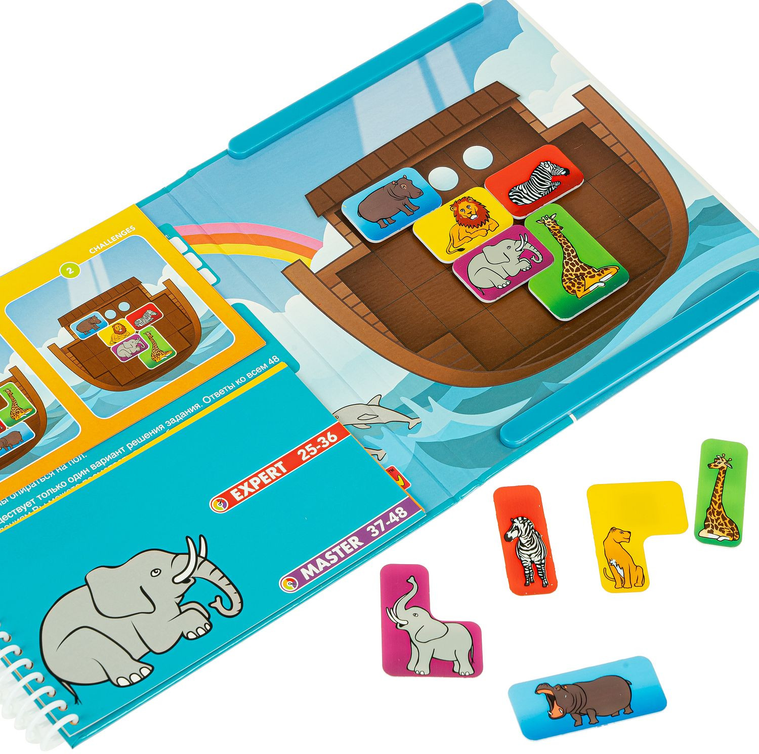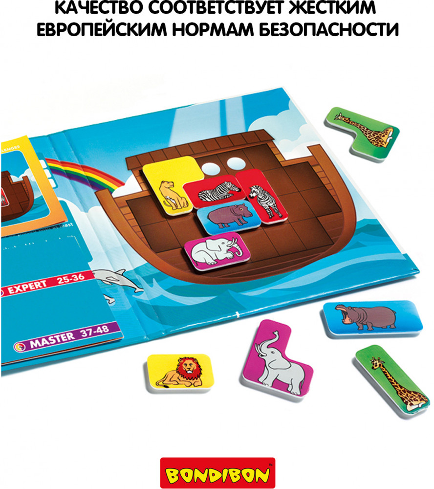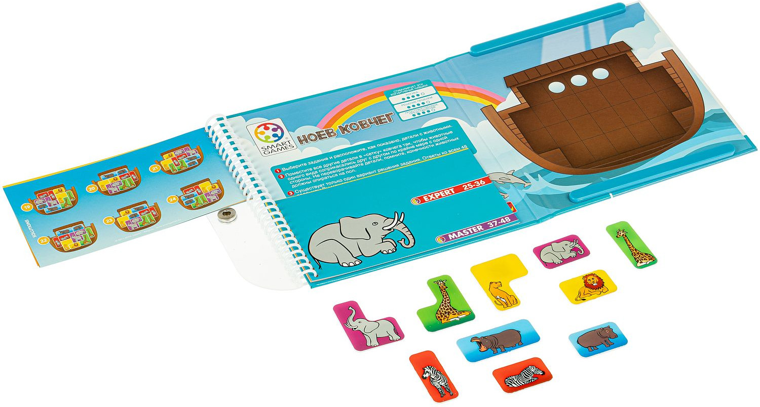 Bondibon Игра магнитная «Ноев ковчег»уровни сложности развивает логику прочные фигурки высокое качество компактность В данный момент этот товар отсутствует в продаже. Возможно, у нас найдется аналогичный или похожий товар здесь. Серия: Smart games Уникальная логическая игра-головоломка для отличного времяпрепровождения и тренировки юного ума. Животные торопятся успеть занять свои места на спасительном ковчеге, построенном Ноем. Но, несмотря на внушительные размеры ковчега, разместиться здесь всем не так-то просто, ведь все животные пришли парами. Помоги всем животных найти свое место, только помни, что пары ни в коем случаем нельзя разлучать! Поверхность игры "Ноев ковчег«— это замечательное «поле действий» для маленького исследователя, компактная игровая доска с магнитными деталями. Содержит 48 заданий и 4 уровня сложности для детей от 5 лет и взрослых. Эта добрая и красивая игра развивает логическое мышление, познавательные способности, зрительное и пространственное восприятие. Компактную игру в виде книжки из плотного картона удобно брать с собой в дорогу. Игра рассчитана на 1 игрока. |