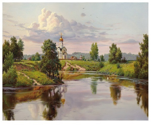 С помощью набора для творчества можно нарисовать картину Игоря Прищепы Русь. На картине изображен разгар лета, на берегу реки возвышается церковь с золотыми куполами.