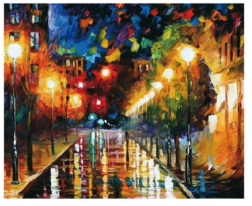 С помощью набора для творчества можно нарисовать ночной бульвар осенью. Повсюду лужи, образовавшиеся после дождя. Улицу хорошо освещает ряд фонарей. В лужах видны отражения соседних зданий.