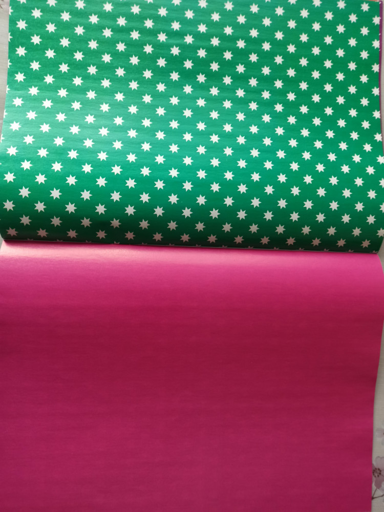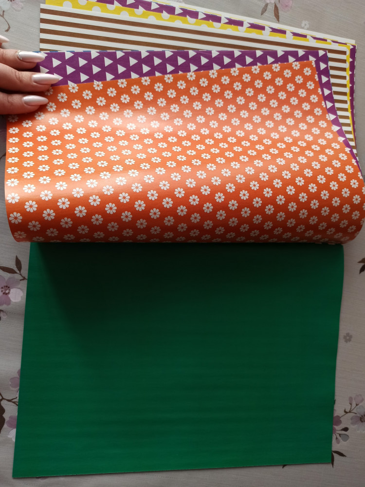 Бумага и правда интересная. Яркая. Гладкая. Не матовая. С одной стороны цвет, с другой узор: звёздочки, полосы, сердечки, цветочки, кружочки, косые полосы, ромб, треугольник. Взяла так же картон несколько видов.
