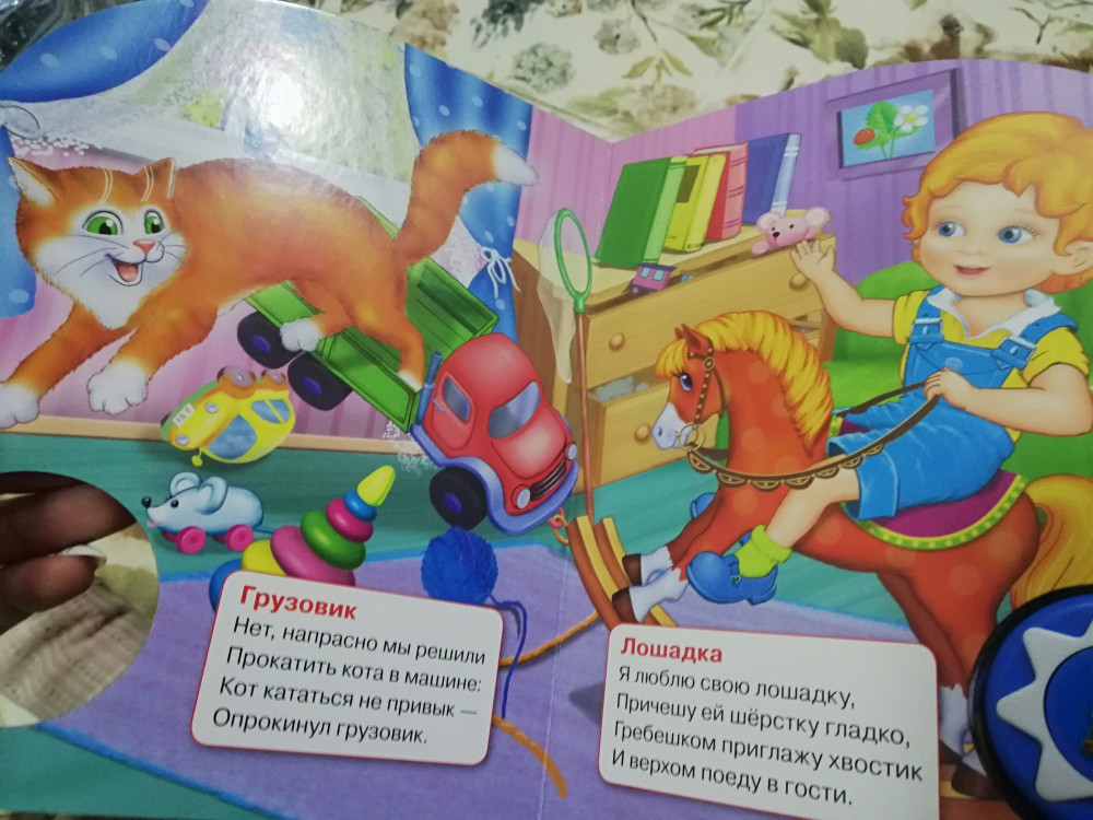 Хорошая книжечка, яркие картинки, все стишки поются . Дала ребёнку, уже минут 40 слушаю 🙃🙃
