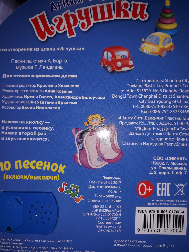 УМка Игрушки. Агния Барто (1 кнопка с 10 песенками)яркие картинки стишки поются небольшая книжечка тихое звучание В данный момент этот товар отсутствует в продаже. Возможно, у нас найдется аналогичный или похожий товар здесь. Серия: 1 кнопка 10 песен Музыкальная книжка «Игрушки» содержит 10 песен на стихи Агнии Барто. На каждой страничке крупные красивые иллюстрации с текстом песенки. Малыш с удовольствием будет рассматривать красочные, яркие странички с героями, слушать песни, подпевать и даже танцевать. Ребёнок легко освоит включение звука: по нажатию на кнопку начинает проигрываться песенка, при втором нажатии звук выключится. Нажав на кнопку ещё раз ребёнок, услышит следующую песню. Композиции исполняются профессиональными артистами. |
