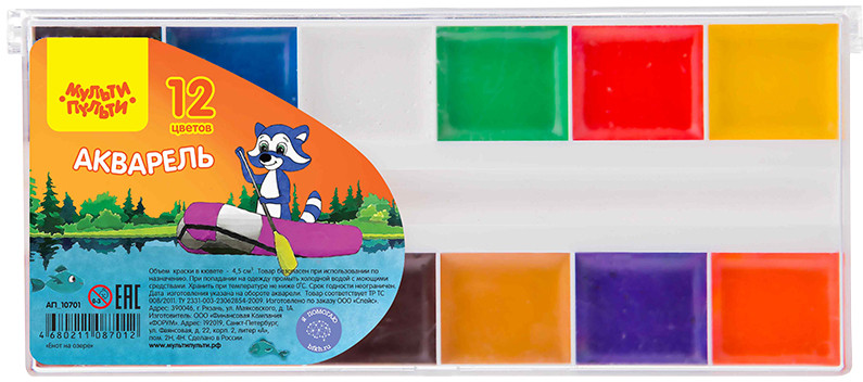 Краски обладают хорошей укрывистостью и остаются яркими при высыхании. Смешивание акварели «Мульти-Пульти» дает чистые оттенки. Натуральные компоненты делают акварель безопасной для здоровья детей.