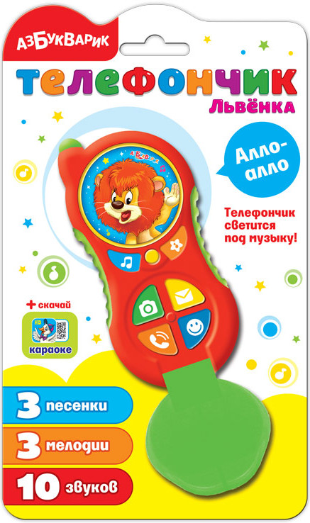 Азбукварик Игрушка музыкальная «Телефончик львёнка»В данный момент этот товар отсутствует в продаже. Возможно, у нас найдется аналогичный или похожий товар здесь. Серия: Алло-алло Теперь у малыша будет свой телефончик — яркий, фигурный, музыкальный, с «экранчиком» и огоньками. С ним можно послушать любимые песенки («Песня Львёнка и Черепахи», «Здравствуй, детство!», «Песенка о лете»), мелодии («Арам зам зам», «Чунга-чанга», «Если нравится тебе, то делай так») и весёлые звуки, а также поиграть с озорным Львёнком. Размер и форма идеально подходят для маленьких ручек. Интерактивная книжка «Караоке» для смартфона или планшета в приложении «Азбукварик» — в подарок. QR-код для скачивания — внутри упаковки. |