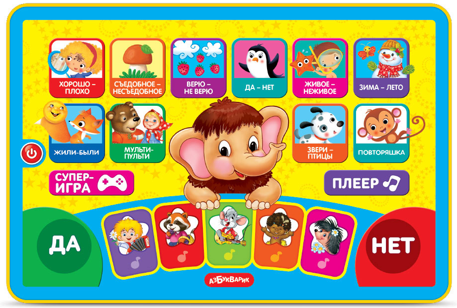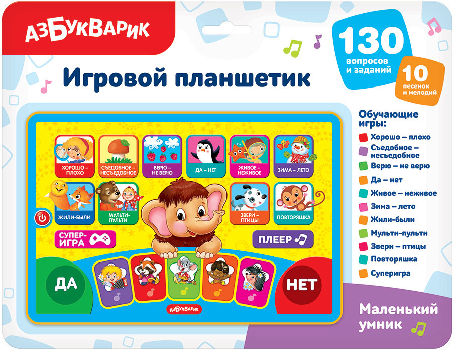 Азбукварик Игрушка музыкальная «Маленький умник»В данный момент этот товар отсутствует в продаже. Возможно, у нас найдется аналогичный или похожий товар здесь. Серия: Игровой планшетик Планшетик для любознательных малышей! 10 игр, 130 вопросов и заданий, 10 песенок и мелодий («Антошка», «Улыбка», «Чунга-чанга», «Облака» и другие) ждут деток. Бонус — возможность скачать интерактивную азбуку для мобильного или планшета по QR-коду на упаковке. |