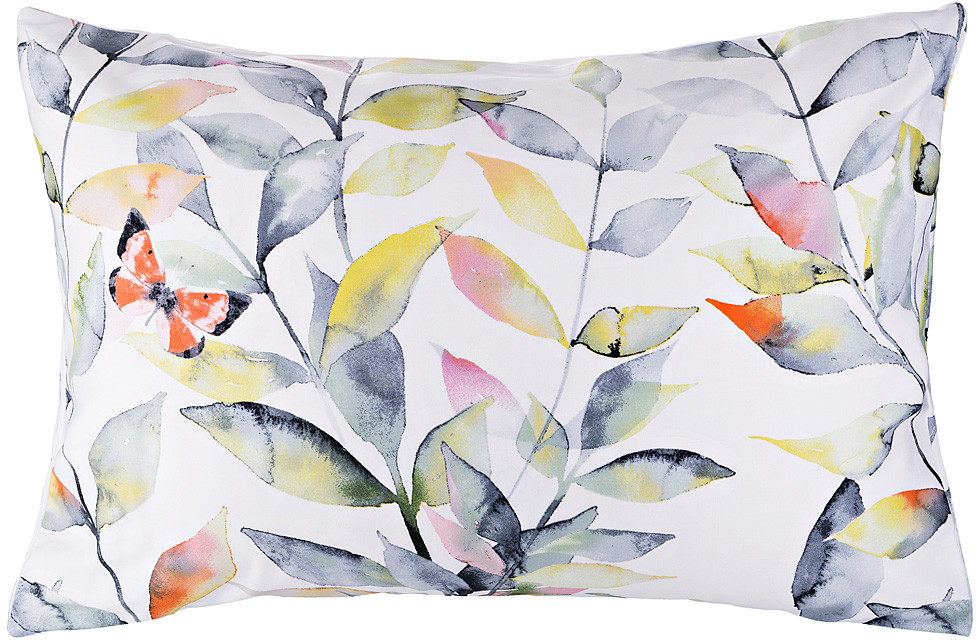 Нежная, мягкая. Сатиновое плетение. С рисунком слегка напортачили - видимо ткань купонная, поэтому кому что достанется. Наволочка выглядит просто белой, серенькие контуры листьев почти незаметны.