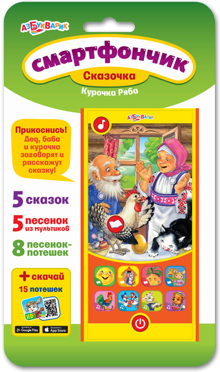 Азбукварик Игрушка музыкальная «Курочка Ряба»В данный момент этот товар отсутствует в продаже. Возможно, у нас найдется аналогичный или похожий товар здесь. Серия: Смартфончик На новом смартфончике записано 5 любимых сказок, 8 весёлых песенок-потешек и 5 хорошо знакомых всем малышам песенок из мультфильмов! Малышу наверняка понравится нажимать на яркие кнопочки, петь и веселиться с любимыми героями. Русские народные сказки: «Курочка Ряба», «Колобок», «Репка», «Теремок», «Заюшкина избушка». Песенки: «Улыбка», «Песенка про кузнечика», «Танец утят», «Какой чудесный день!», «Добрый жук». Потешки: «Петушок», «Каравай», «Два весёлых гуся», «Калинка», «Серенький козлик», «Идёт коза рогатая», «Мишка косолапый», «Ножки, ножки, где вы были?». QR-код внутри упаковки для бесплатного скачивания 15 интерактивных потешек на смартфон или планшет. |