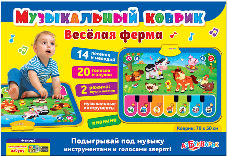 Азбукварик Игрушка музыкальная «Весёлая ферма»В данный момент этот товар отсутствует в продаже. Возможно, у нас найдется аналогичный или похожий товар здесь. Серия: Музыкальный коврик Этот суперковрик приведет малыша в восторг. Он такой большой, яркий и музыкальный! Нажимай на картинки — зверюшки фермы и весёлые мультяшки порадуют веселыми песенками и мелодиями: «Калинка», «Барыня», «Валенки», «Ах вы, сени мои, сени», «Частушки», «Светит месяц», «Во поле берёза стояла», «Песенка про кузнечика», «Пусть бегут неуклюже», «Танец маленьких утят», «Антошка», «Добрый жук», «Два весёлых гуся», «Улыбка». В коврике есть настоящее пианино с большими цветными клавишами — то, что нужно для маленьких музыкантов. А если звучит песенка — ребенок сможет подыграть голосами зверят и звуками музыкальных инструментов. Так гораздо веселее! Ищи QR-код на вкладыше внутри коробки. |