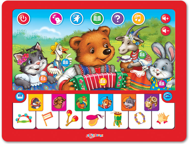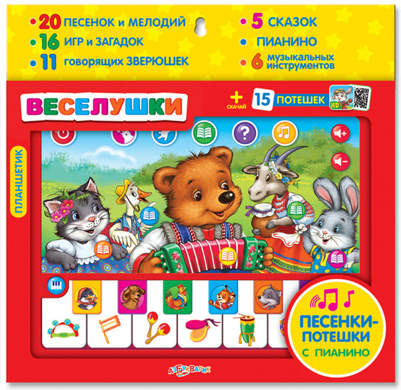 Азбукварик Игрушка музыкальная «Веселушки»В данный момент этот товар отсутствует в продаже. Возможно, у нас найдется аналогичный или похожий товар здесь. Серия: Планшетик С новым музыкальным планшетиком скучать не придётся! «Веселушки» — это забавные говорящие зверюшки, любимые песенки и сказки («Гуси-лебеди», «Маша и медведь»,«Волк и семеро козлят», «Заюшкина избушка», «Кот, петух и лиса»), игры и загадки! Ещё в планшетике есть настоящее пианино специально для маленьких музыкантов. Попробуй сыграть на нем — нажимай на клавиши. А когда герои поют — подыграй им на 6 музыкальных инструментах. 20 потешек и мелодий будут звучать каждый раз по-новому! Ещё больше сюрпризов — в приложении от «Азбукварика»! Найди вкладыш с QR-кодом внутри коробки и скачай 15 интерактивных потешек! |