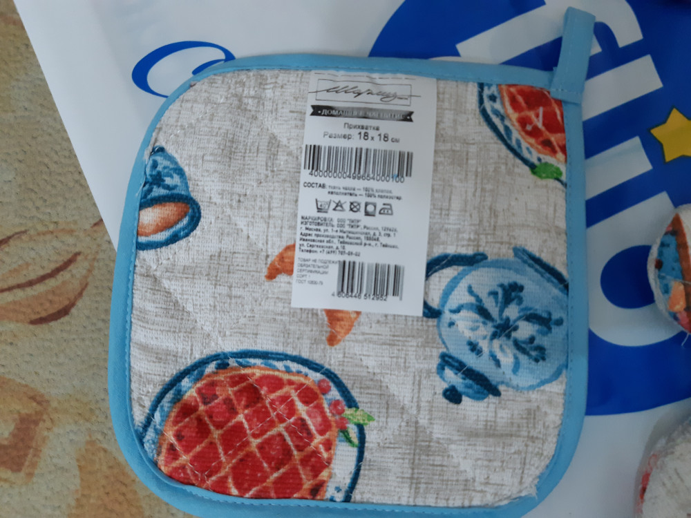 Прихватка неплохая, красивая, но снимаю звезду за несоответствие цвета, цвет окантовки оказался серым, а не как на фото голубой цвет, а так неплохо, симпатично.
