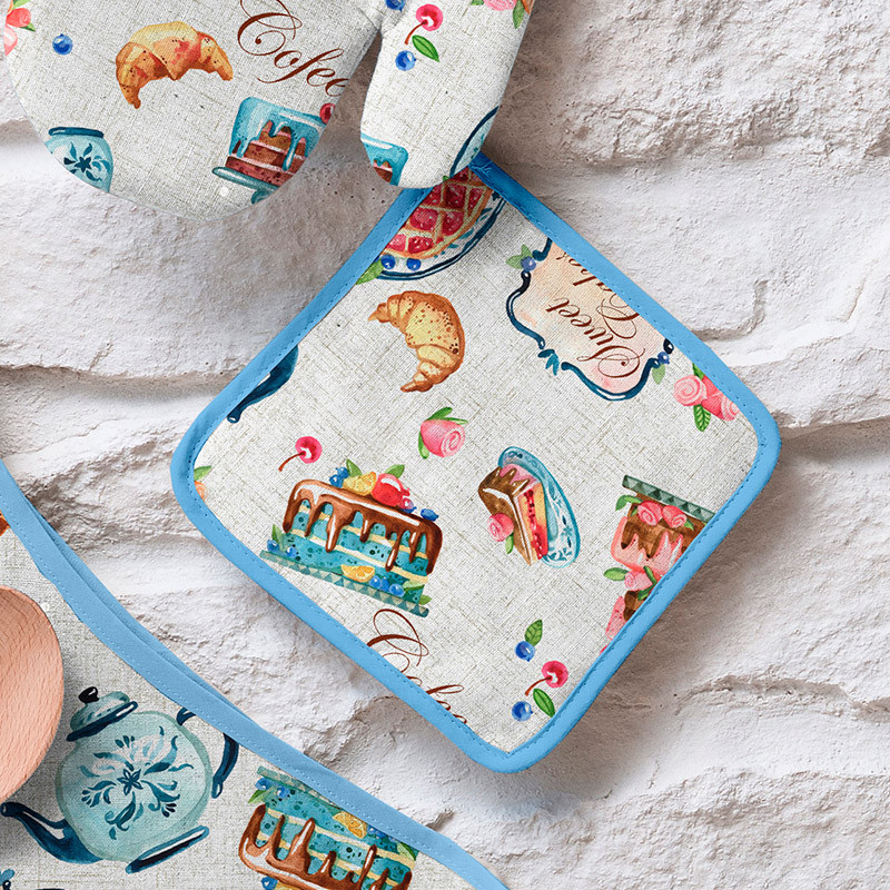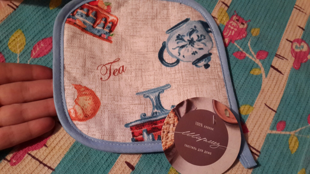 Супер вообще, аккуратно всё прошито, ни одной ниточки торчащей, материал приятный - хлопок. У меня набор "Домашнее чаепитие", докупила туда одну прихватку.