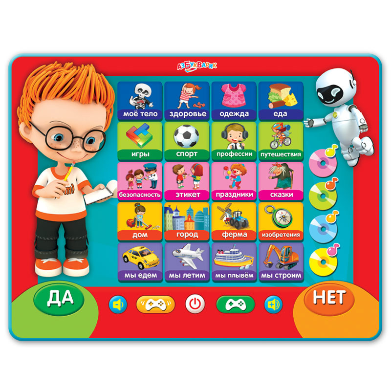 Азбукварик Игрушка музыкальная «Кто самый умный?»В данный момент этот товар отсутствует в продаже. Возможно, у нас найдется аналогичный или похожий товар здесь. Серия: Планшетик Этот говорящий планшетик — прекрасный подарок для маленьких эрудитов! 200 умных вопросов, 20 игровых тем, 3 уровня — играй и узнавай много интересного! Выбирай одну из увлекательных викторин — «Марафон» или «Фортуна». Отвечай на вопросы с весёлым Максом и становись Суперзнатоком! А мини-плеер с любимыми песенками («Песенка друзей», «Пусть бегут неуклюже», «Улыбка», «Танец маленьких утят») поднимет настроение! Ответил на все вопросы? Тогда попробуй отгадать загадки про животных! Найди QR-код на бесплатное скачивание 20 интерактивных загадок в приложении «Азбукварика»! |