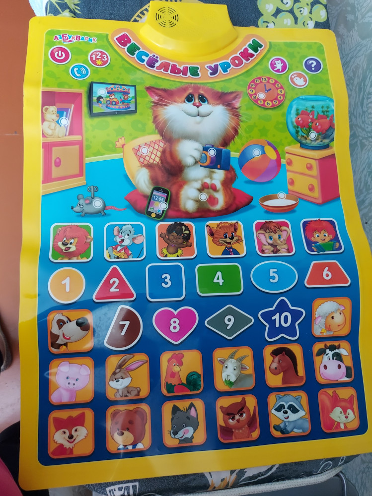 Плакат понравился, хороший звук, всё работает, нареканий нет. Снизила бал, из-за того что кнопки не выпуклые, малышу не очень интересно нажимать вне куда.
