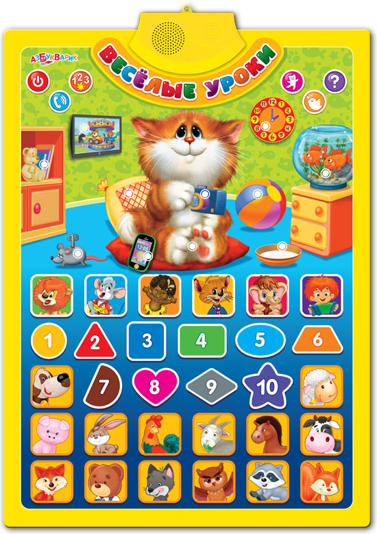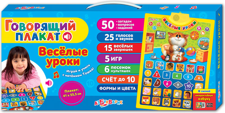 Азбукварик Звуковой плакат «Весёлые уроки»В данный момент этот товар отсутствует в продаже. Возможно, у нас найдется аналогичный или похожий товар здесь. Серия: Говорящий плакат Играй и учись с котёнком Тошей! Нажимай на картинки — изучай цифры, формы и цвета, знакомься с животными, слушай песенки мультяшек («Какой чудесный день!», «Антошка», «Чунга-чанга», «Песенка Мамонтёнка» и другие) и забавные звуки! А ещё в новом плакатике малыша ждут увлекательные игры: «Первые знания», «Позвони зверятам», «Угадай песенку» и «Загадайка». На коробке вы найдёте приятный бонус — QR-код, по которому можно скачать интерактивную азбуку в приложении «Азбукварика»! |