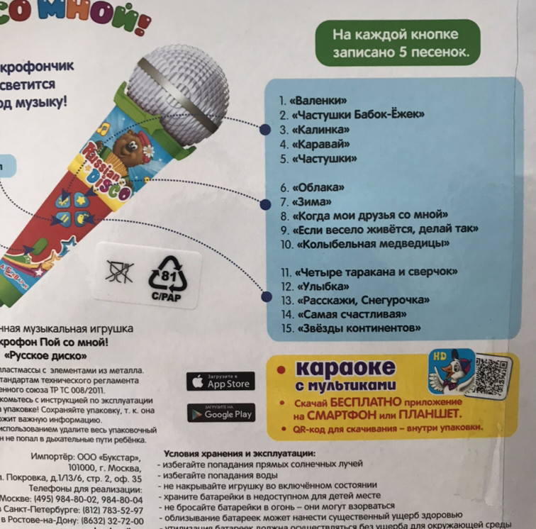 Заказываю уже второй микрофон во Флипе, первым были довольны, а именно этот вызвал еще больше радости у малышей. Батарейки в комплекте, что порадовало. Звук негромкий, спокойный, песенки знакомые, взрослые подпеваем, дети повторяют и пляшут, микрофон просто праздник! Спасибо за качественные игрушки по приемлемым ценам.