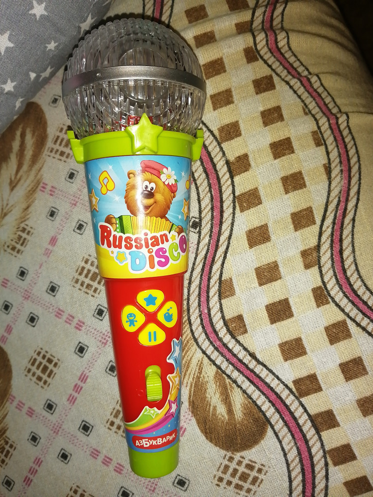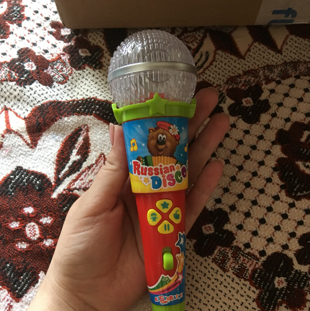 Получили микрофон, понравился звук в меру, как нужно для ребёнка, ребёнку понравился, советую.