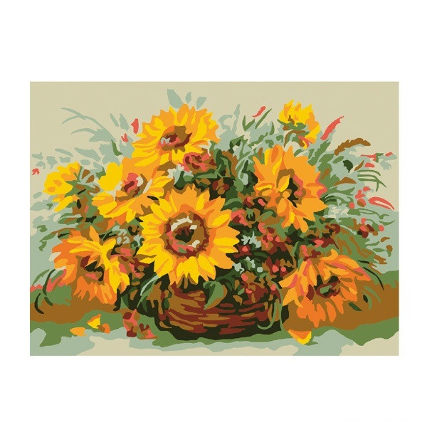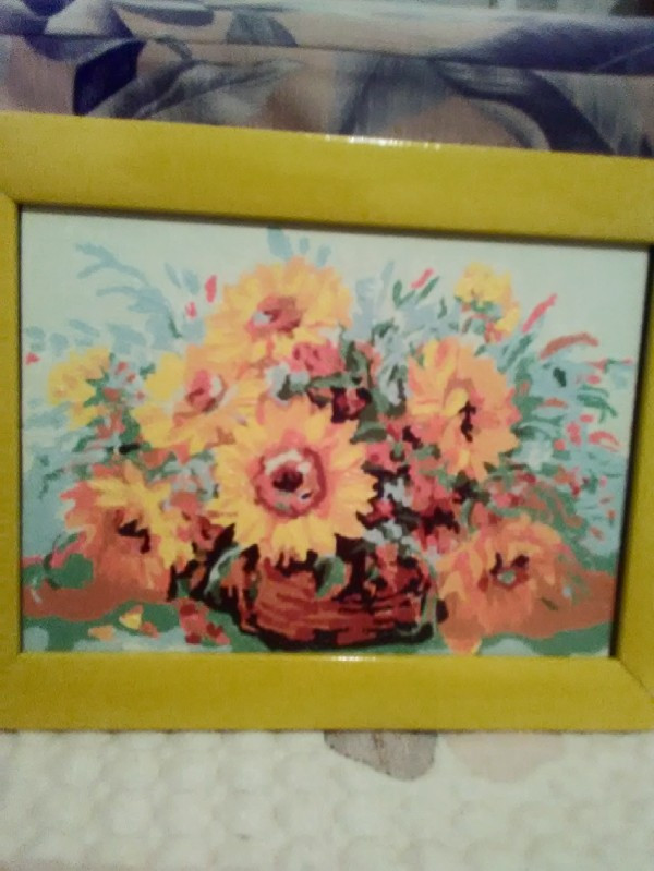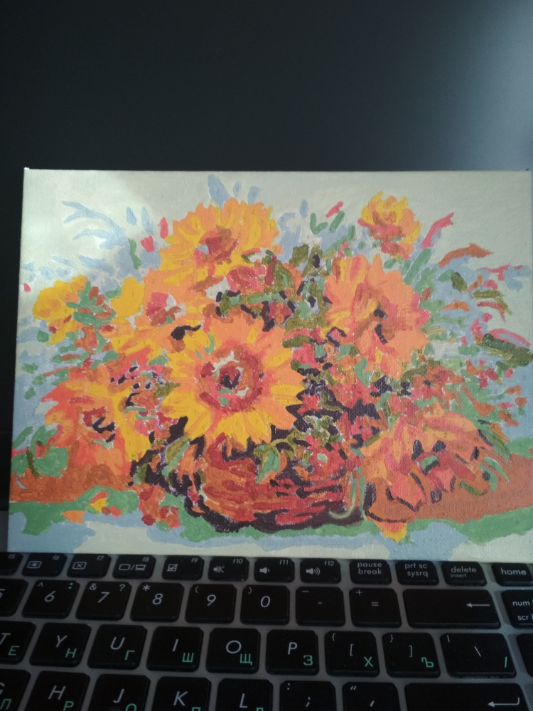 Всё, что люблю: маленький формат, тёплая палитра, подсолнухи и возможность внести свои краски и штрихи (чёрный показался не очень гармоничным в "корзине", заменила коричневым разного оттенка). Подарила маме, ей очень)) Яркая и живая