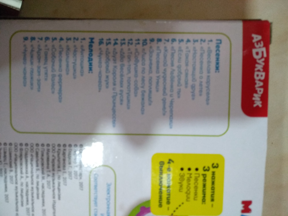 Нам магнитофончик не очень понравился. Маленький, ну это мы знали, мелодии и песенки очень короткие, и не так много как подумала увидев картинку. На фото перечень песенок и мелодии, а не как я ожидала по 45.