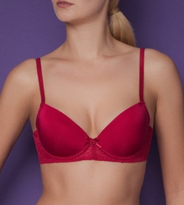 Базовый бюстгальтер из эластичной ткани и кружева, декорированный атласным бантиком с розочкой. Модель T-Shirt с формованной чашкой с небольшим Push-up для всех размеров. Бретели регулируемые, съемные.