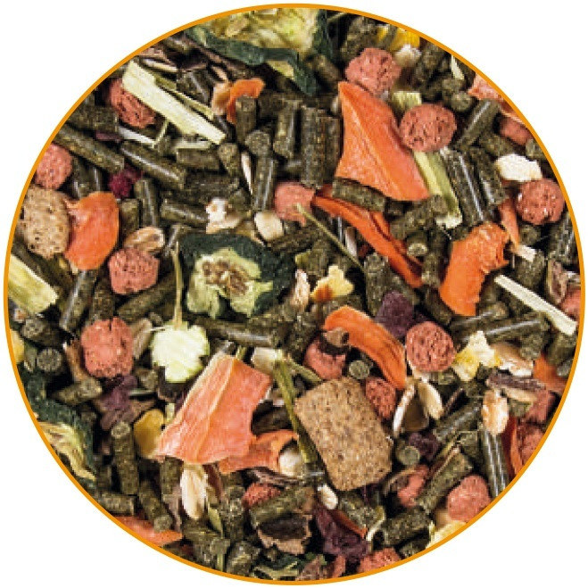 Состав: производные растительного происхождения, злаки; овощи (сушеные морковные кусочки 4%, свекла 0,5%, цуккини 0,5%), фрукты (шиповник 1%), семена, минералы. |