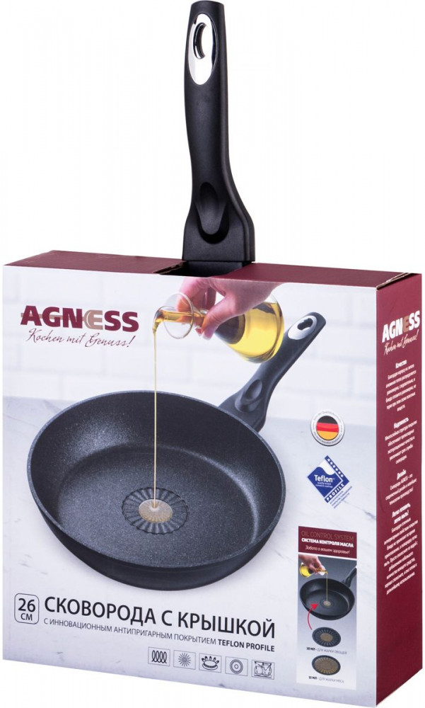 Сковорода с крышкой Agness Teflon Profile станет отличным дополнением к набору вашей кухонной утвари и позволит воплотить в жизнь любые, даже самые смелые, кулинарные идеи. Жарьте, тушите, пассеруйте — такой сковороде под силу буквально все!