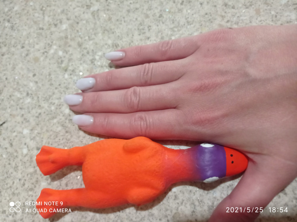 Товар плохой, игрушка маленькая, написано что 14.5см я из интереса измерила 13.2, для крупных пород не пойдёт, моя овчарка ее за час порвала, не советую данный товар, тонкая резина.