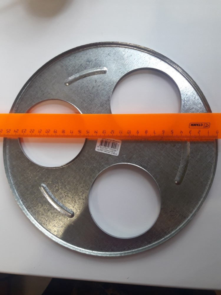 Большой, прочный круг. На фото с лицевой и оборотной стороны. Диаметр отверстий 8,5 см.