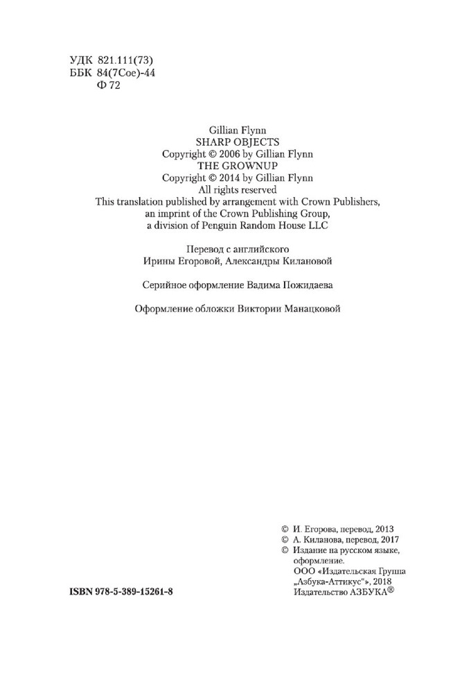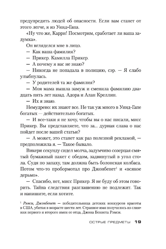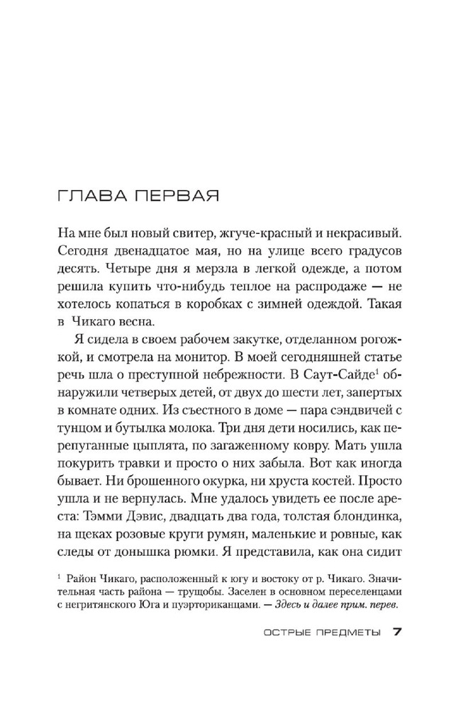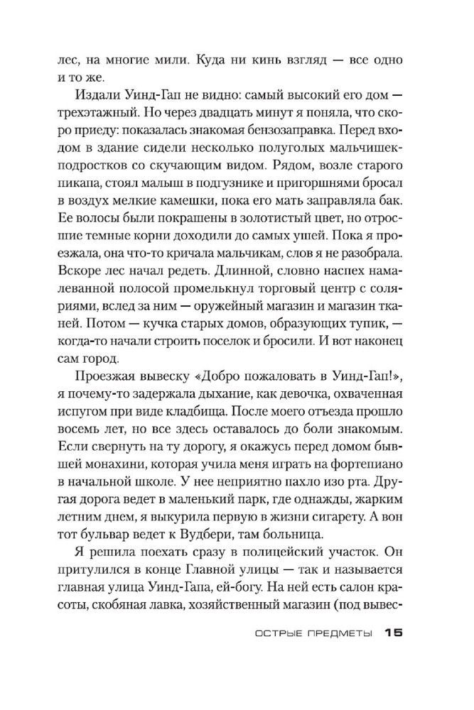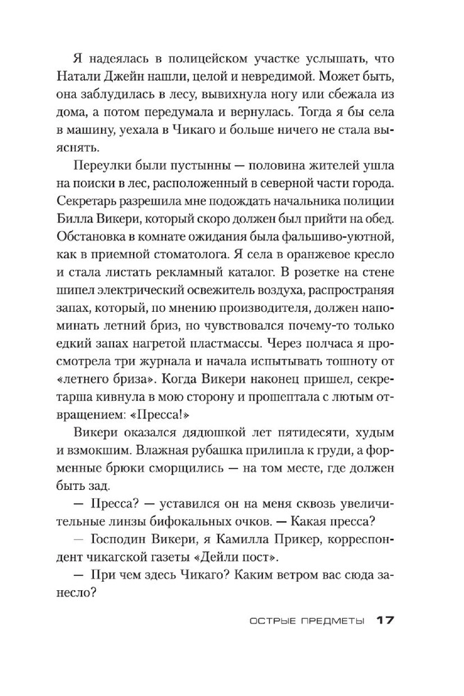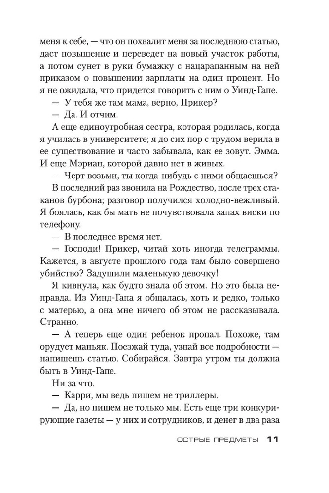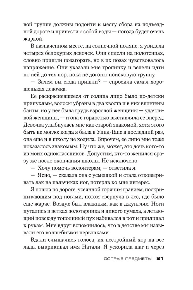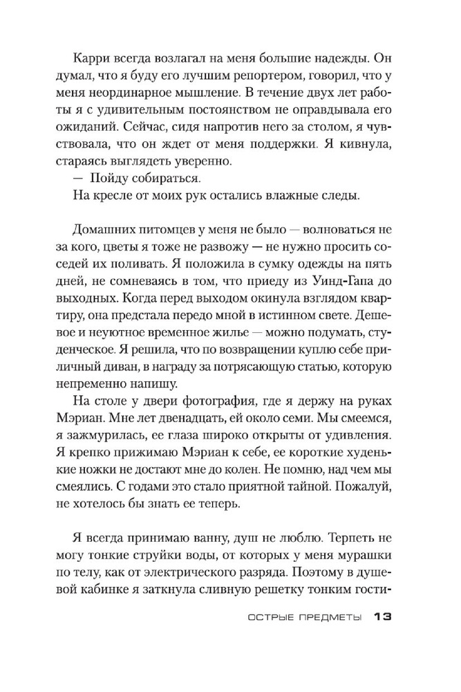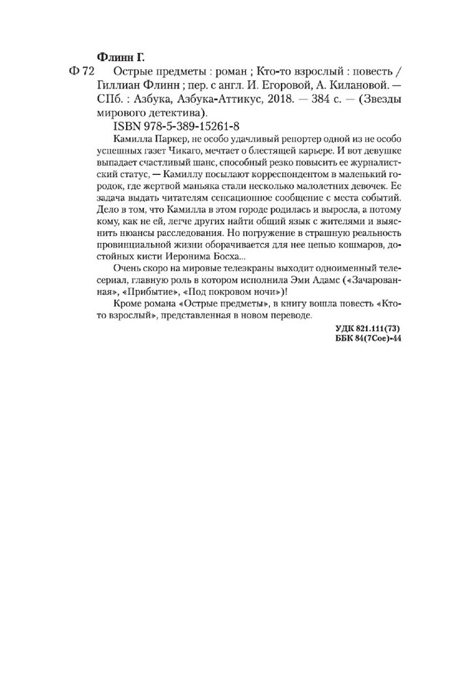 Острые предметыВ данный момент этот товар отсутствует в продаже. Возможно, у нас найдется аналогичный или похожий товар здесь. Серия: Звезды мирового детектива (обложка) Камилла Паркер, не особо удачливый репортер одной из не особо успешных газет Чикаго, мечтает о блестящей карьере. И вот девушке выпадает счастливый шанс, способный резко повысить ее журналистский статус, — Камиллу посылают корреспондентом в маленький городок, где жертвой маньяка стали несколько малолетних девочек. Ее задача выдать читателям сенсационное сообщение с места событий. Дело в том, что Камилла в этом городе родилась и выросла, а потому кому, как не ей, легче других найти общий язык с жителями и выяснить нюансы расследования. Но погружение в страшную реальность провинциальной жизни оборачивается для нее цепью кошмаров, достойных кисти Иеронима Босха... Очень скоро на мировые телеэкраны выходит одноименный телесериал, главную роль в котором исполнила Эми Адамс («Зачарованная», «Прибытие», «Под покровом ночи»)! Кроме романа «Острые предметы», в книгу вошла повесть «Кто-то взрослый», представленная в новом переводе. |