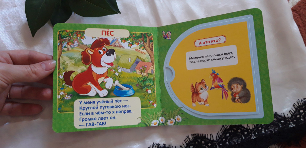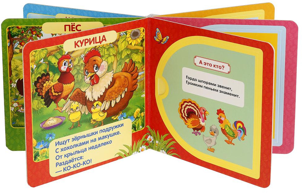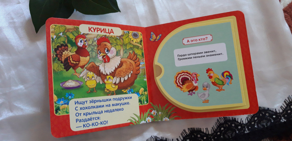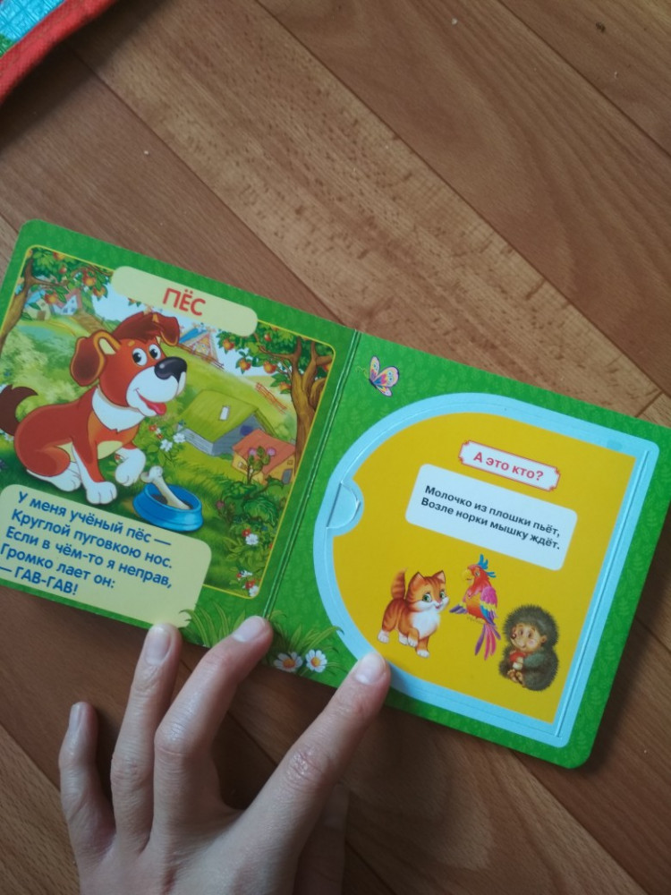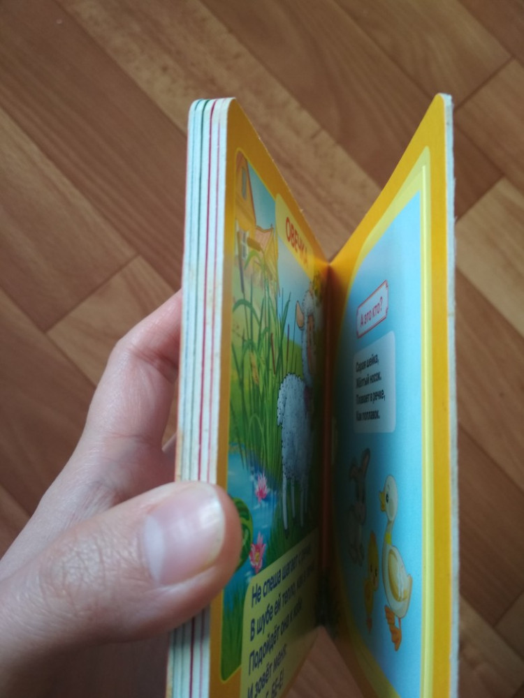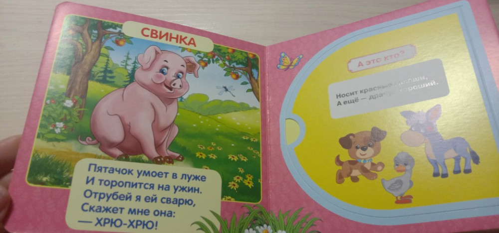 Книжка очень маленькая по размеру, детским ручкам тяжеловато открывать. А так содержание очень хорошее, качество страниц тоже, картинки яркие красивые