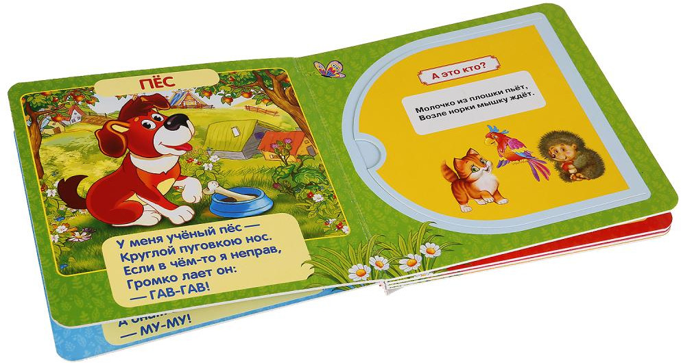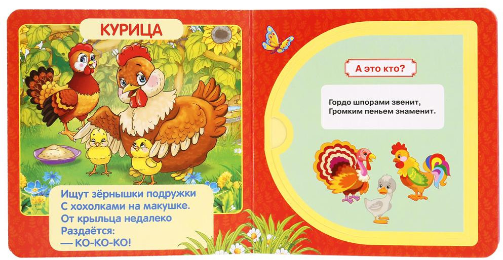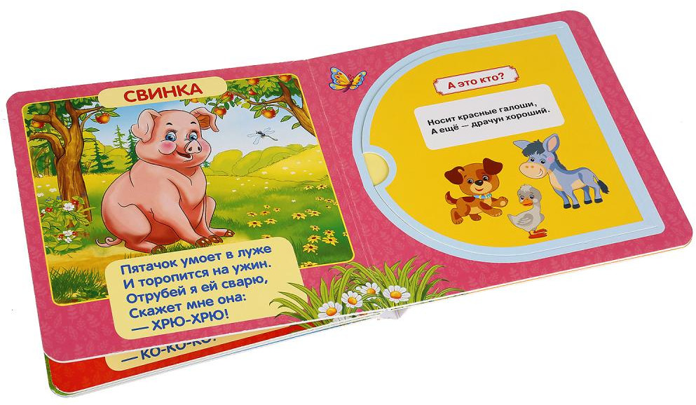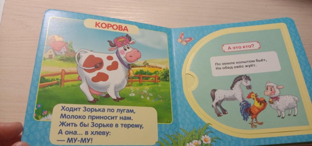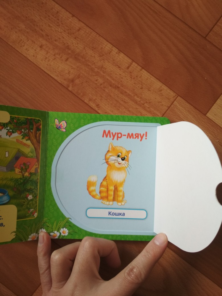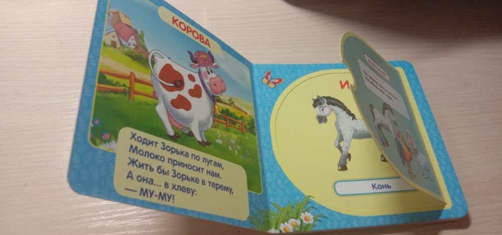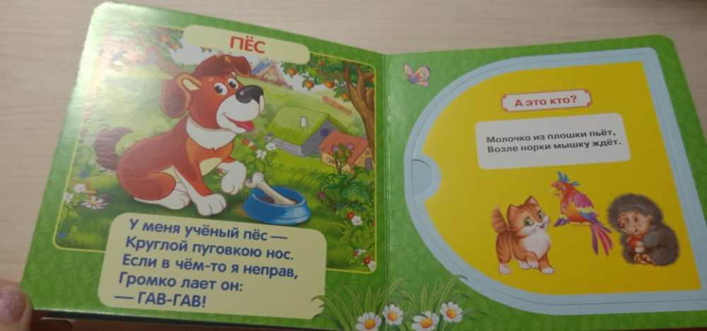 Очень понравилось открывать окошки моему годовалому сыну. Книжка маленького формата, листы жёсткие, картинки яркие, хорошая книжка. Всего 5 разворотов.