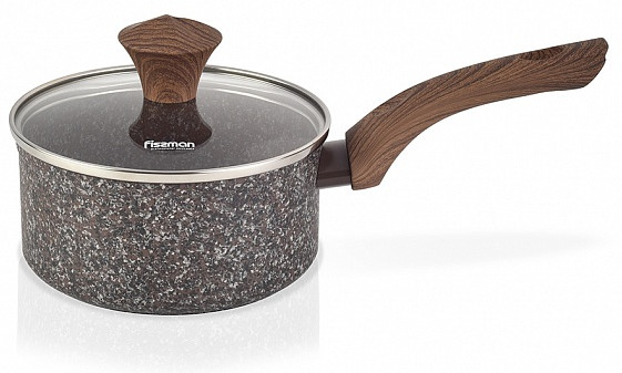 Ковш со стеклянной крышкой и бакелитовыми ручками. Изготовлен из алюминия с антипригарным покрытием EcoStone. Главное преимущество заключается не только в толстом дне, но устойчивость к износу и царапинам, благодаря инновационной технологии создания многослойного антипригарным покрытия, усиленного вкраплениями каменных частиц. Можно мыть в посудомоечной машине.