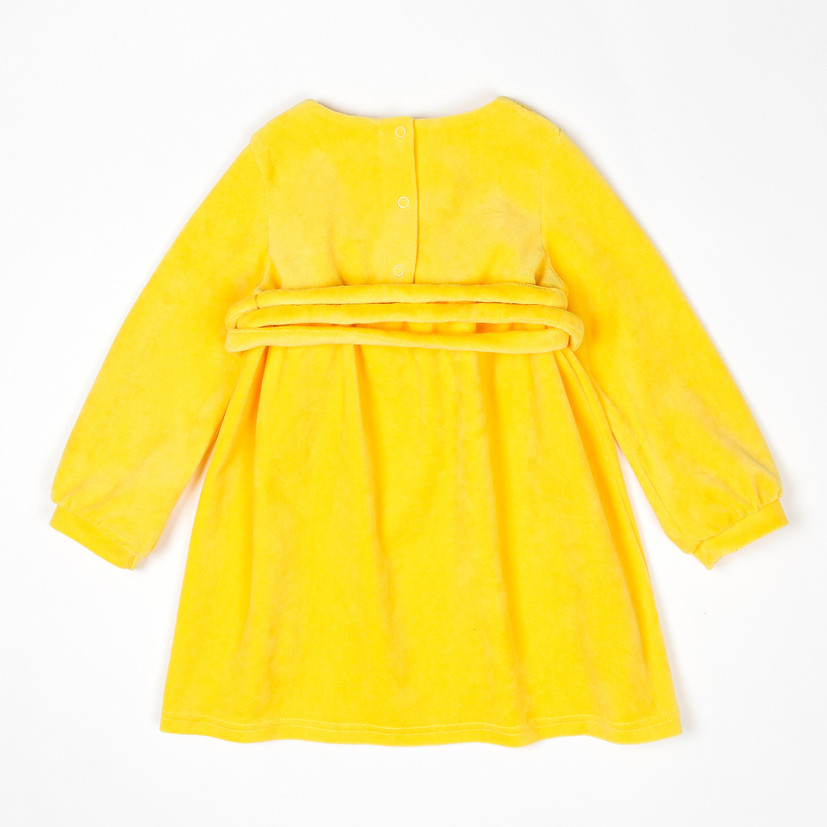 Очень понравился цвет платья. Яркий, красивый. Пояс сделан непонятно. Его надо вокруг прокручивать раза три, такая длинная верёвка. Но я не стала отрезать поясок, так как пока доча бегала, он не развязался ни разу и не мешал ей.
