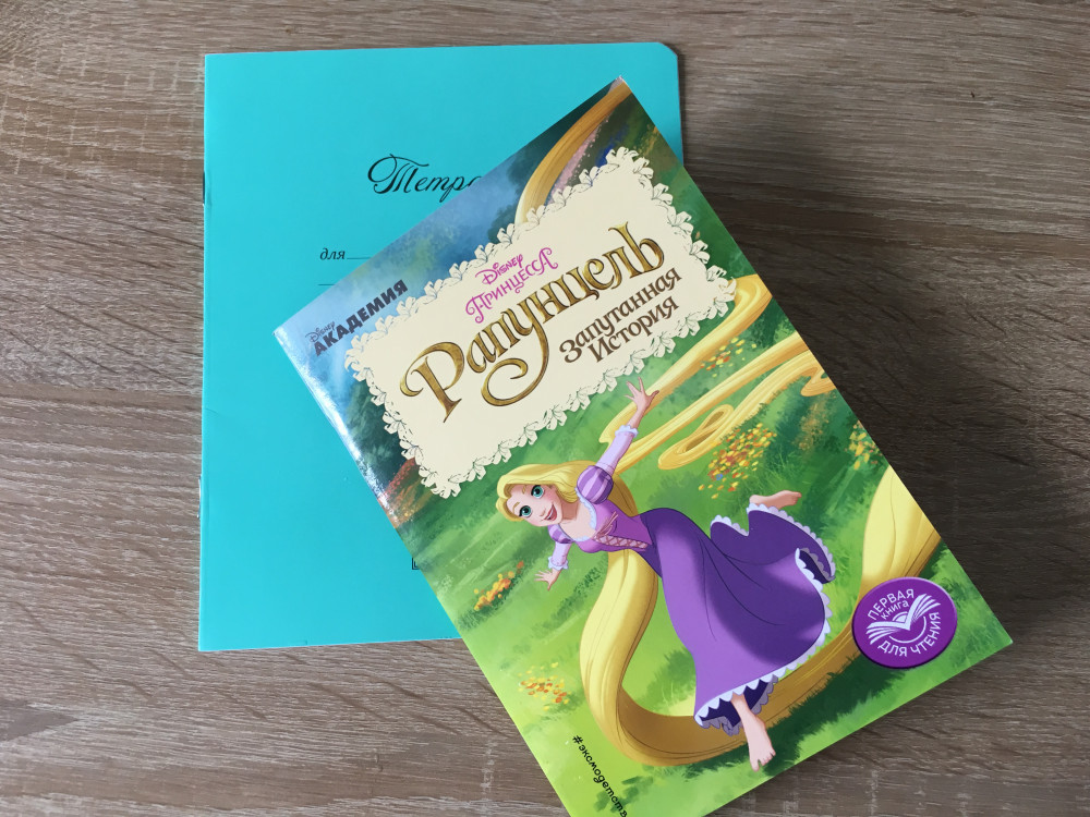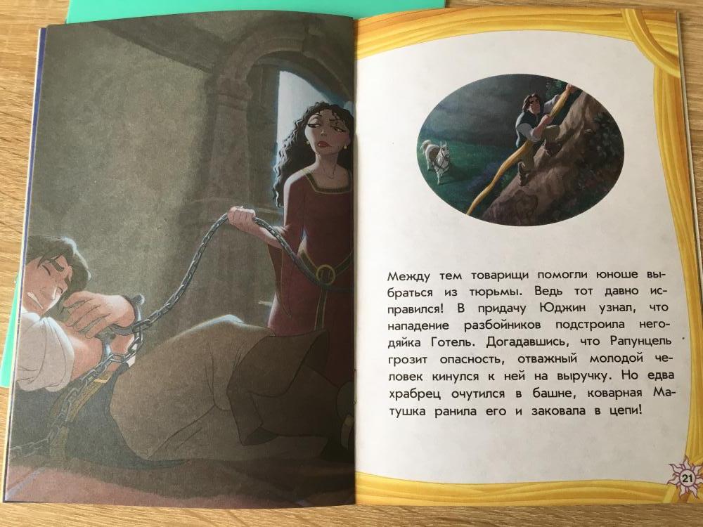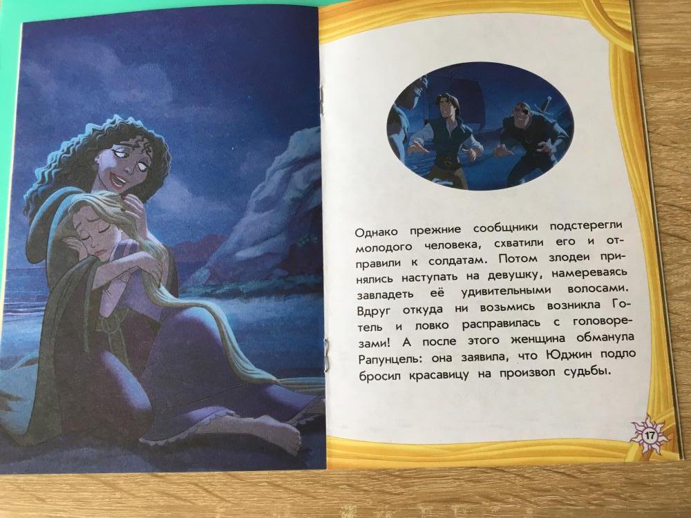 Доча обожает мультфильм Рапунцель. Купила ей эту книгу, теперь несколько раз в день её читаем. Книга небольшая, тонкая, обложка из плотного картона. Картинки яркие, взяты из мультфильма. В конце книги вопросы для проверки на внимательность)