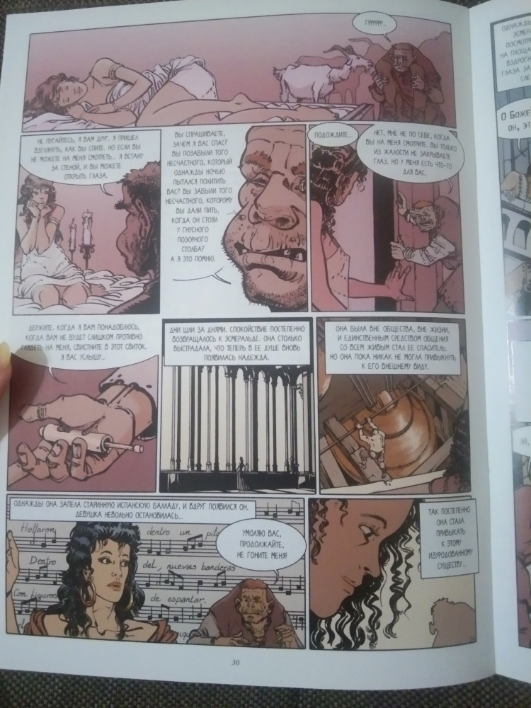 Я ожидала что комикс будет размером с обычную книжку, но была приятно удивлена. Комикс большой, широкий, удобно читать. Рисовка интересная, напоминает старые американские комиксы. Поначалу, она вызывала у меня отторжение, но быстро привыкнув, я и не заметила, как стала с удовольствием рассматривать каждый рисунок. Что же касается сюжета, то он довольно поверхностный. Не было углубления в персонажей, в события. Это просто сухой пересказ. Но у меня нет к этому претензий, так как в самом комиксе написано, что он предназначен для подростков, и что для того, чтобы полностью проникнуться этой историей, нужно читать книгу. В конце есть небольшие заметки о самой истории романа, о Викторе Гюго, о том, что сподвигло его создать «Собор Парижской Богоматери». За такую цену, я считаю это очень даже неплохим дополнением к книге.