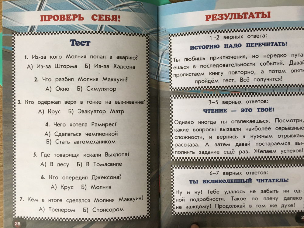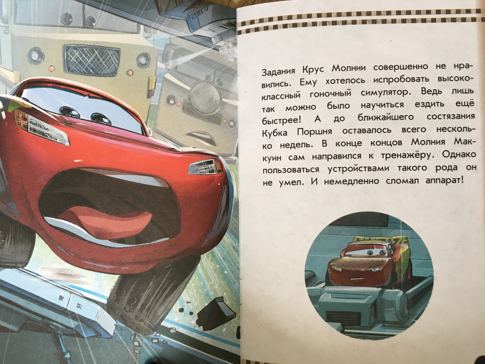 Книжечка маленькая, меньше тетради. Шрифт, на мой взгляд, мелковат для «тренажёра по чтению». Формат книги такой, что удобно брать с собой, места не займёт и веса не прибавит, но как книгу для домашней библиотеки я бы не рассматривала. Больше всего разочаровала бумага, она серая, на вид и на ощупь чуть плотнее газетных листов. Из плюсов - красочные иллюстрации/кадры из мультика (на каждом развороте по 2 картинки) и в конце тестовые задания на понимание текста, и содержания книжки в целом.