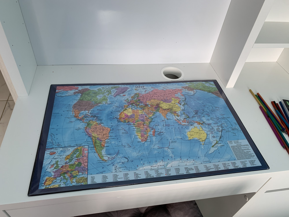 Идея карты на столе мне нравится - ребёнку 9 лет, рассматривает, задаёт вопросы. Ненавязчиво формируются географические знания. Если говорить о прямом назначении - для письма жестковато. Зато в перевёрнутом положении можно использовать для рисования красками и/или фломастерами, маркерами. Стол не будет испачкан. В одном из предыдущих отзывов выражается сомнение относительно актуальности данных. Да, на карте написано "Алма-Ата", но "Нур-Султан". Видимо, это свидетельствует об опечатке, а не распечатке старой карты без внесения корректив.