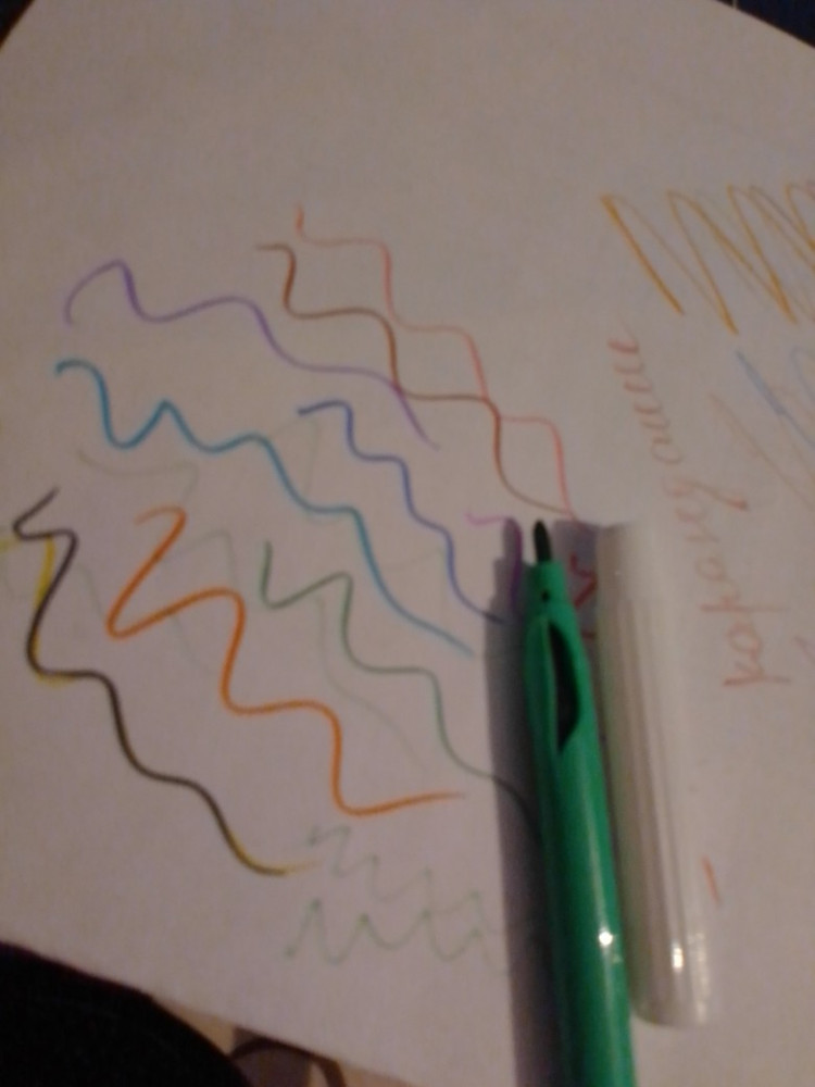 Хорошие фломастеры, для трудов дет.садовцев самое то! Яркие и не сухие. Тонкую бумагу скатывают, если рисовать на одном и том же месте.